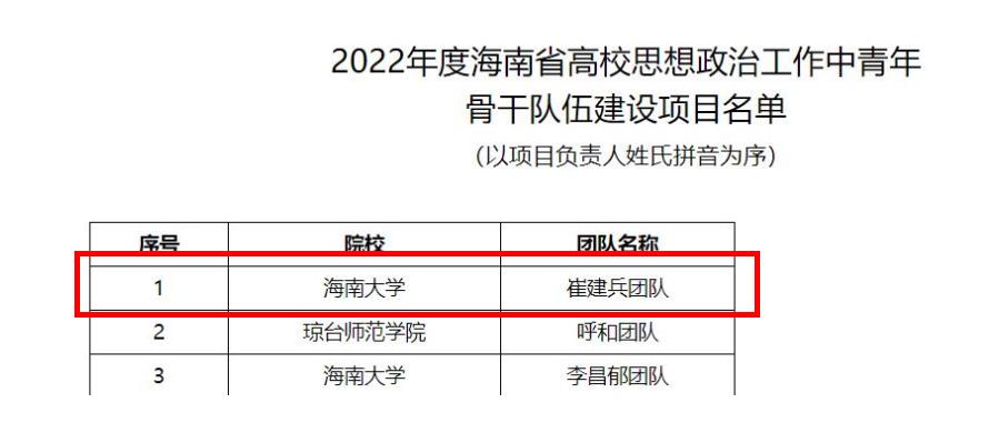 近日,海南省教育厅公布2022年度高校思想政治工作有关培育建设部分项目结果,公司崔建兵老师团队入选2022年度海南省高校思想政治工作中青年骨干队伍(全省每年资助10个团队)。