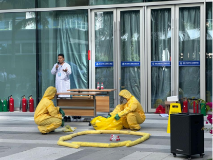 本次演练内容为模拟员工进行化学实验时不慎将管控类危险化学品溢洒的突发安全事件应急处置场景。事故发生后,实验室安全员、实验室负责人第一时间进行专业处理、实施自救,并启动应急响应、逐级上报,公司实验室安全指导小组在评判分析后第一时间启动实验室安全事故应急预案,安全保卫处做好现场警戒,专业应急救援小组对发生事故实验室开展应急处置。