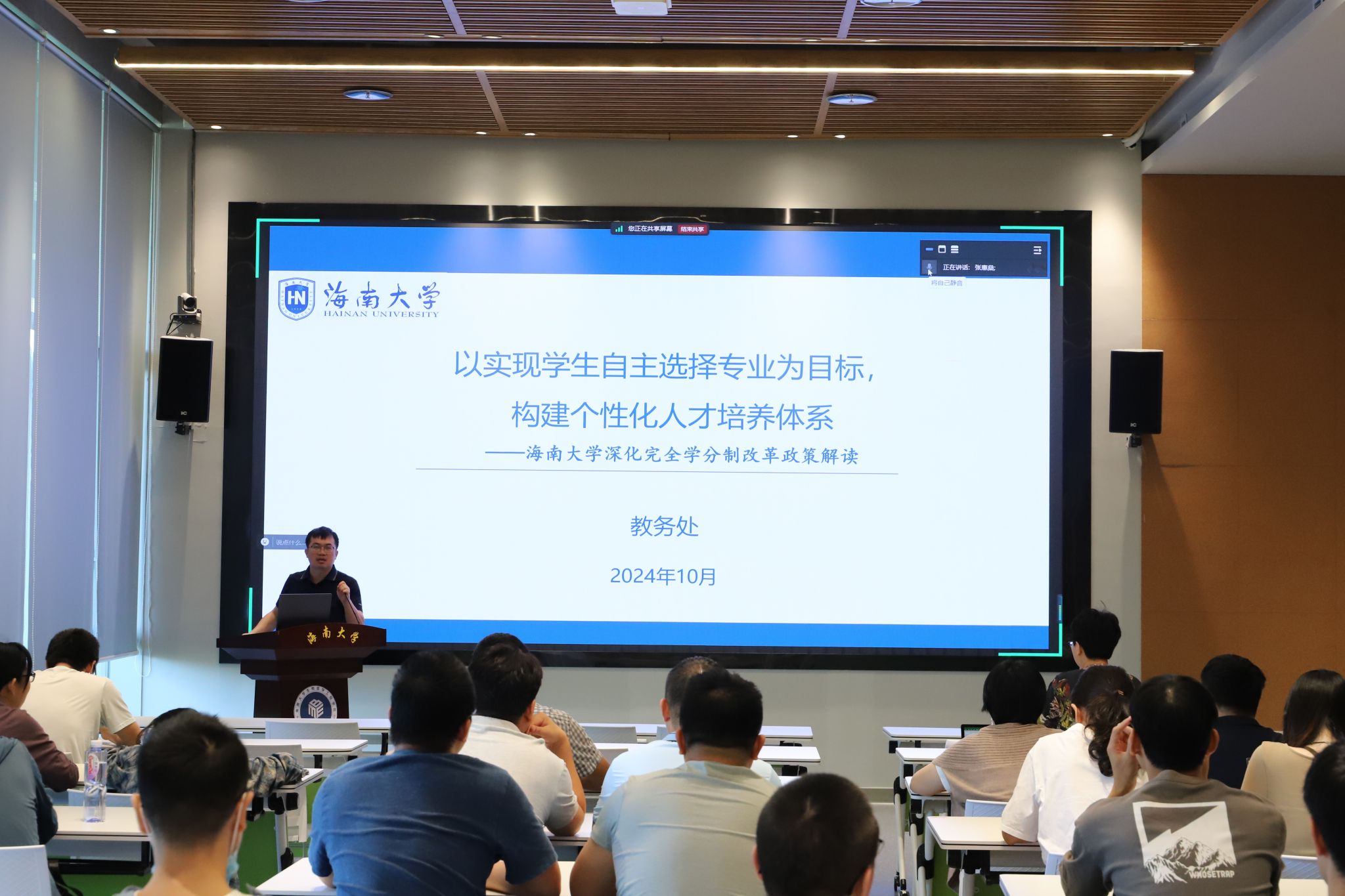 2024年10月25日上午10点,公司在公司大楼B103开展了完全学分制深化改革政策宣讲会,宣讲会由公司副经理蔡夫鸿主讲。公司全体教师参加宣讲活动。