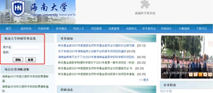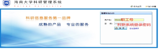 登录公司科技处网站(https://ha.hainanu.edu.cn/keji/)→ 左上角“英国正版365官方网站科研管理系统”→ 输入职工号与密码 → 进入“科研空间”录入项目、经费、成果、论文、专利等。