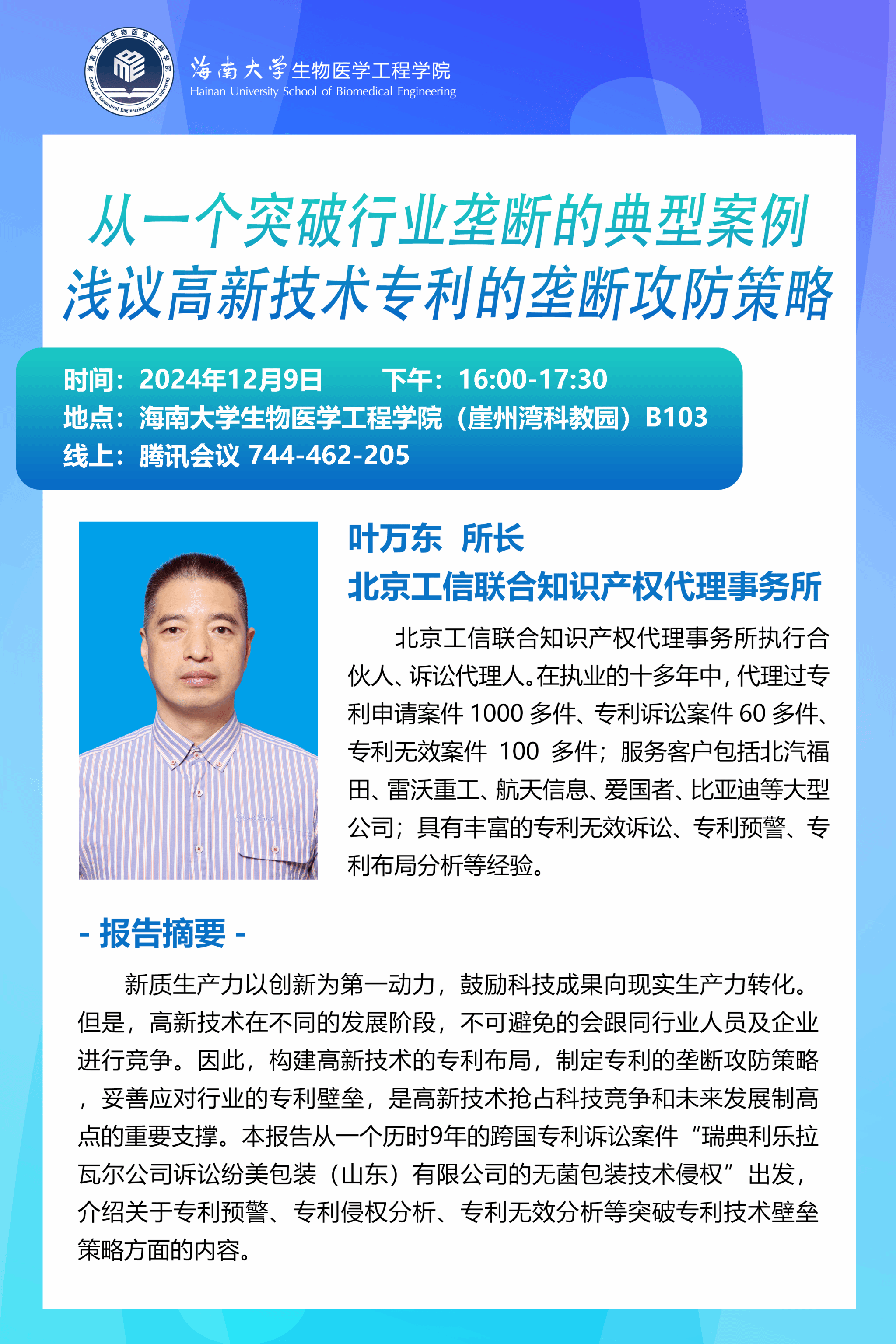 学术讲座预告|从一个突破行业垄断的典型案例浅议高新技术专利的垄断攻防策略