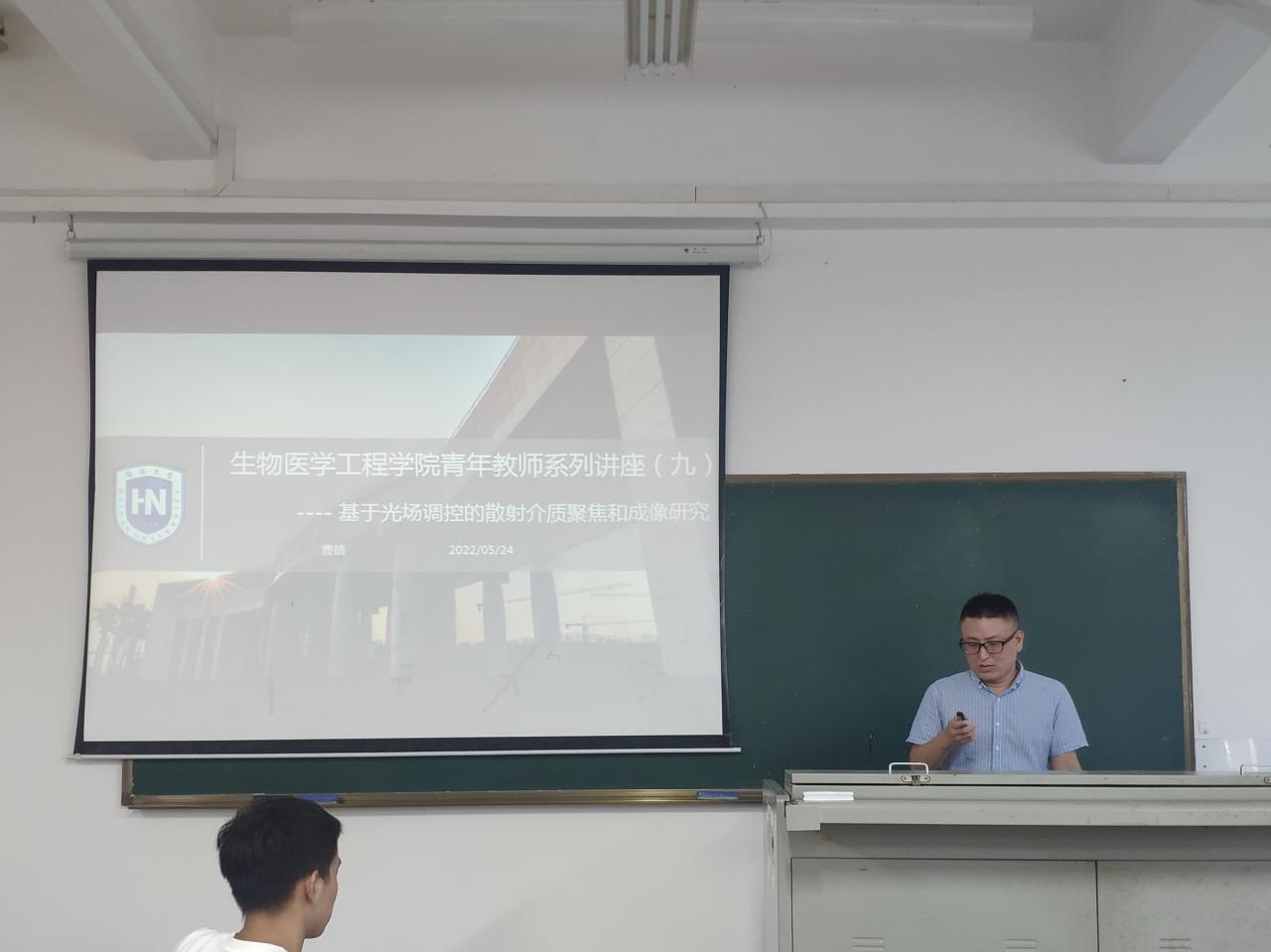 随后,曹老师从宏观到微观,从大气中的云层到生物体的组织举列说明了什么是散射介质以及与散射介质相关的研究现状,同时,曹老师结合自身的研究方向,对聚焦中光场调控的方法进行介绍,即迭代式波前整形、测量样品的传输矩阵、光学相位共轭和神经网络。最后,曹老师将人生比作光入射的过程,在光入射前,需要调制出较优的波形,好的波形在入射后,才能达到理想效果,调制波形类似于同学们不断的学习,只有学习到了一定程度,后面的路才能走的更加顺利。曹老师还提醒同学们要在各自的领域不断学习,提高能力,增强兴趣。