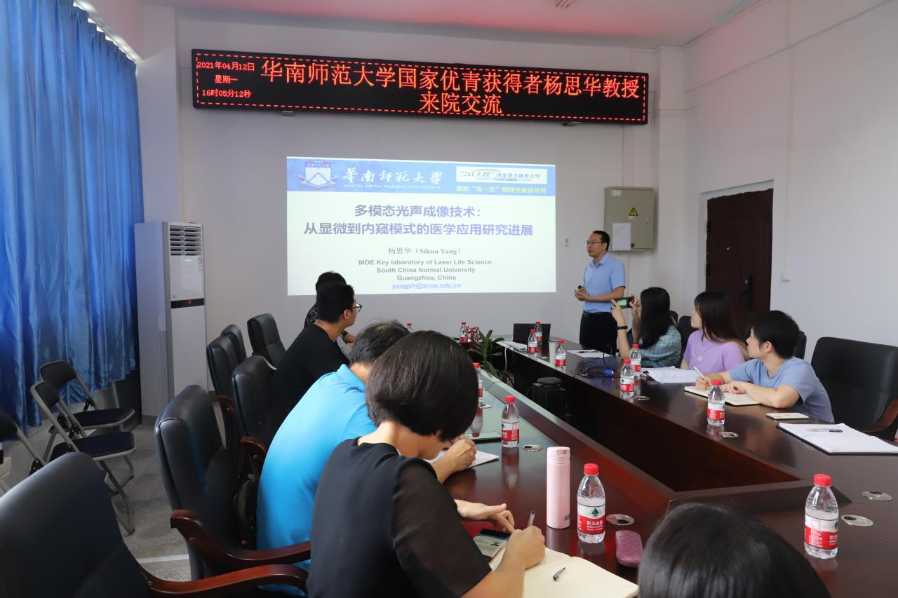 2021年4月12日下午,华南师范大学激光生命科学教育部重点实验室主任杨思华教授应邀分享多模态光声成像技术——从显微到内窥模式的医学应用研究。英国上市公司365周非凡、黄振立、卓俊杰、田朝阳老师,部分博士生、研究生和本科生参加讲座。讲座由张云竹书记主持。