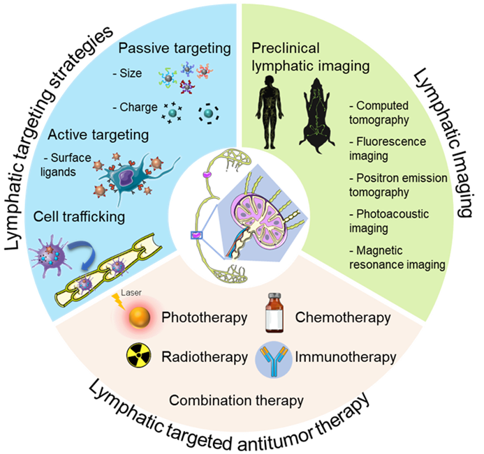 免疫疗法被认为是适用于多种肿瘤治疗的安全有效方法。淋巴系统包括淋巴结、淋巴管和淋巴细胞,是一个覆盖全身具有复杂网络结构和免疫调节功能的系统。靶向淋巴系统的纳米颗粒不仅能够为肿瘤的早期诊断提供独特信息,同时也为解决肿瘤治疗药物的脱靶效应和非特异性靶向等问题提供契机。作者在文中综述介绍了用于靶向淋巴系统的纳米颗粒的设计策略,包括纳米颗粒尺寸、表面电荷、形状和分子量等被动靶向策略,以及表面修饰抗体或配体等主动靶向策略;结合淋巴管和淋巴结内淋巴细胞的独特性能和不同注射方式,详细介绍了纳米颗粒高效靶向淋巴系统的方法;描述了淋巴成像在肿瘤转移诊断和图像引导手术中的最新应用;重点阐述了靶向淋巴系统的纳米疫苗和纳米药物在肿瘤特异性治疗中的相关策略;最后,作者对当前增强抗肿瘤免疫治疗的主要策略和靶向淋巴系统的肿瘤疗法进行了总结,并展望了未来靶向淋巴系统的纳米平台,旨在推动此研究领域在抗肿瘤治疗中的发展和临床应用。