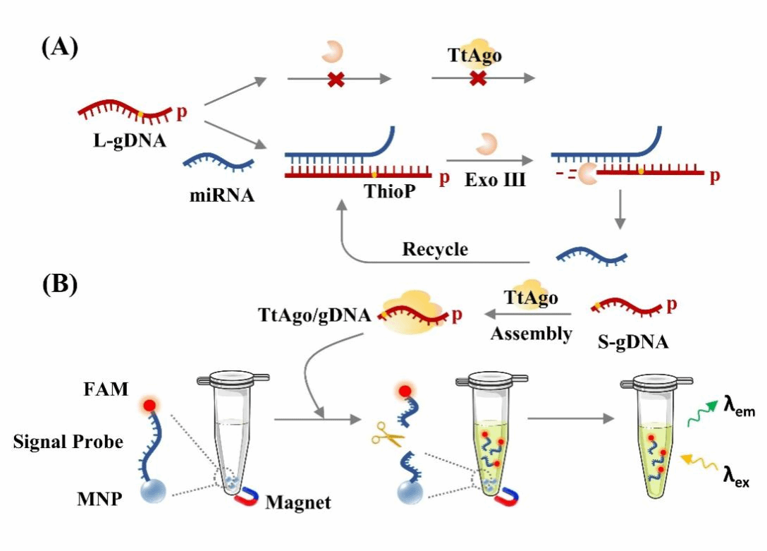 microRNA是一类小的非编码RNA(约19-25 nt),在多种生物过程中发挥重要的调节作用。microRNA的表达异常与许多疾病(如癌症)的发生和发展密切相关,因而可作为一类非常有前景的诊断标志物。近年来,原核生物的基因防御防御系统(典型的比如CRISPR),被发现具有高特异的、可编程的基因靶向活性,并被广泛应用于基因的编辑和表达调控。Argonaute是一种CRISPR相关蛋白,具有组成更简单、设计更灵活等优势。该研究系统地探讨了革兰氏阴性嗜热栖热菌来源的Argonaute的剪切特性,并构建了一个外切酶III辅助的靶标循环扩增系统(exoAgo)用于高灵敏的microRNA检测。研究结果表明,exoAgo可用于皮摩尔级别的miRNA检测,并实现同家族miRNA单碱基差异的区分,在血清模拟样品中也可以保持良好的检测能力。这项研究为Ago在核酸检测中的进一步应用提供了参考,并为microRNA的高灵敏检测提供了一种新的方法。