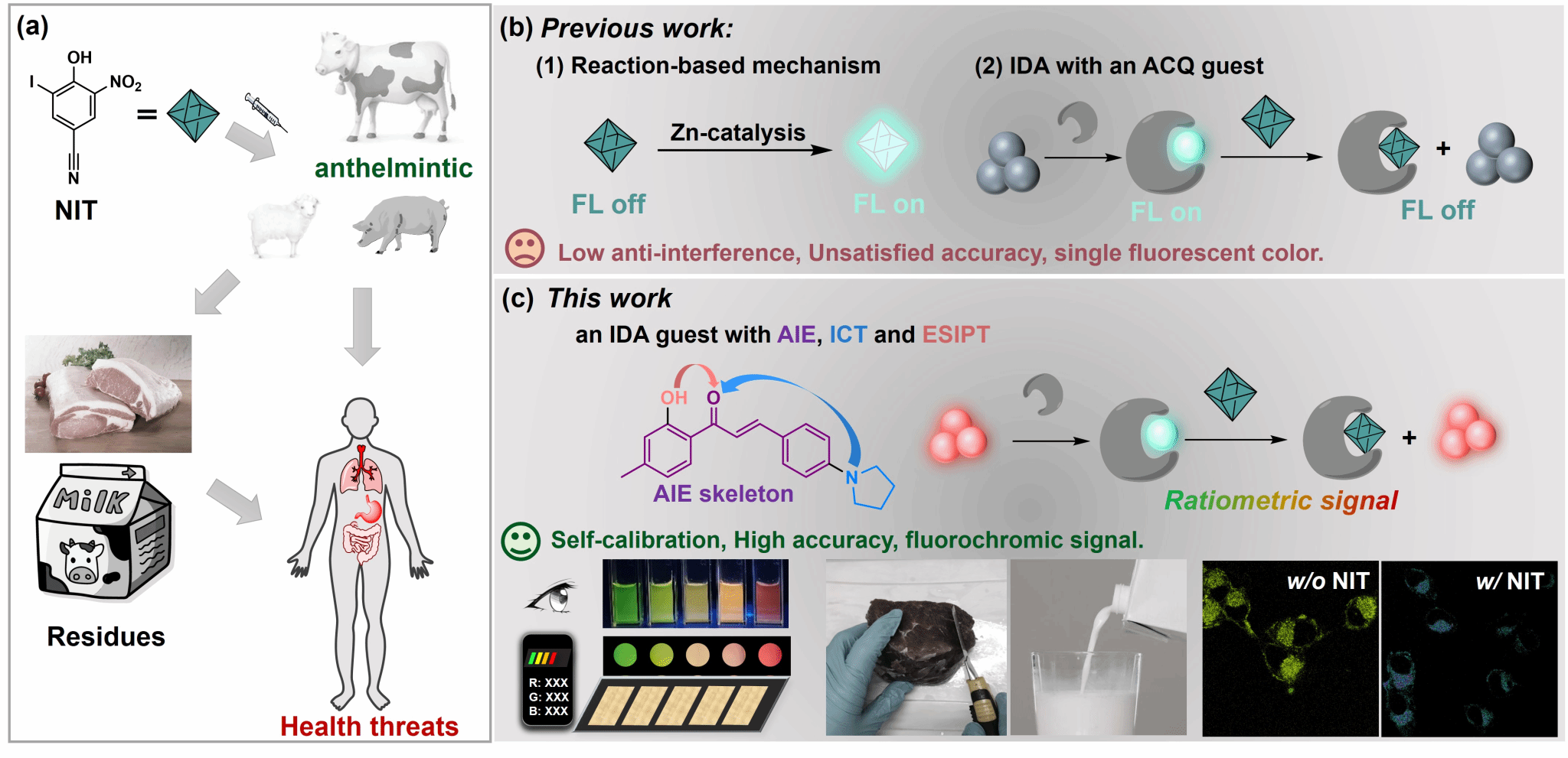 该团队基于白蛋白(ALB)与一种兼具AIE和ESIPT效应的荧光染料构建了主客体荧光探针,利用NIT的配体竞争作用可获得探针对NIT的比率荧光响应。探针的快速响应、高灵敏度使其可定量检测全脂、脱脂牛奶中的NIT含量。进一步作者制备便携式荧光试纸实现对牛奶、牛肉中的NIT含量的快速分析。利用该探针的比率响应信号还可在共聚焦显微镜的双通道模式下准确观测细胞内NIT的分布情况。
