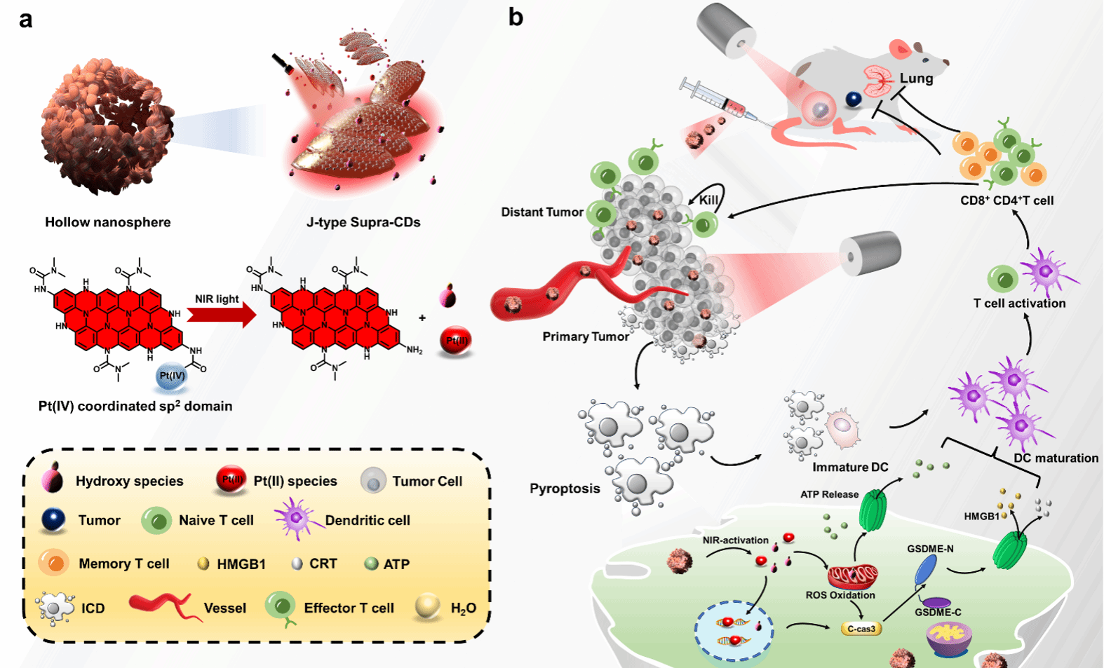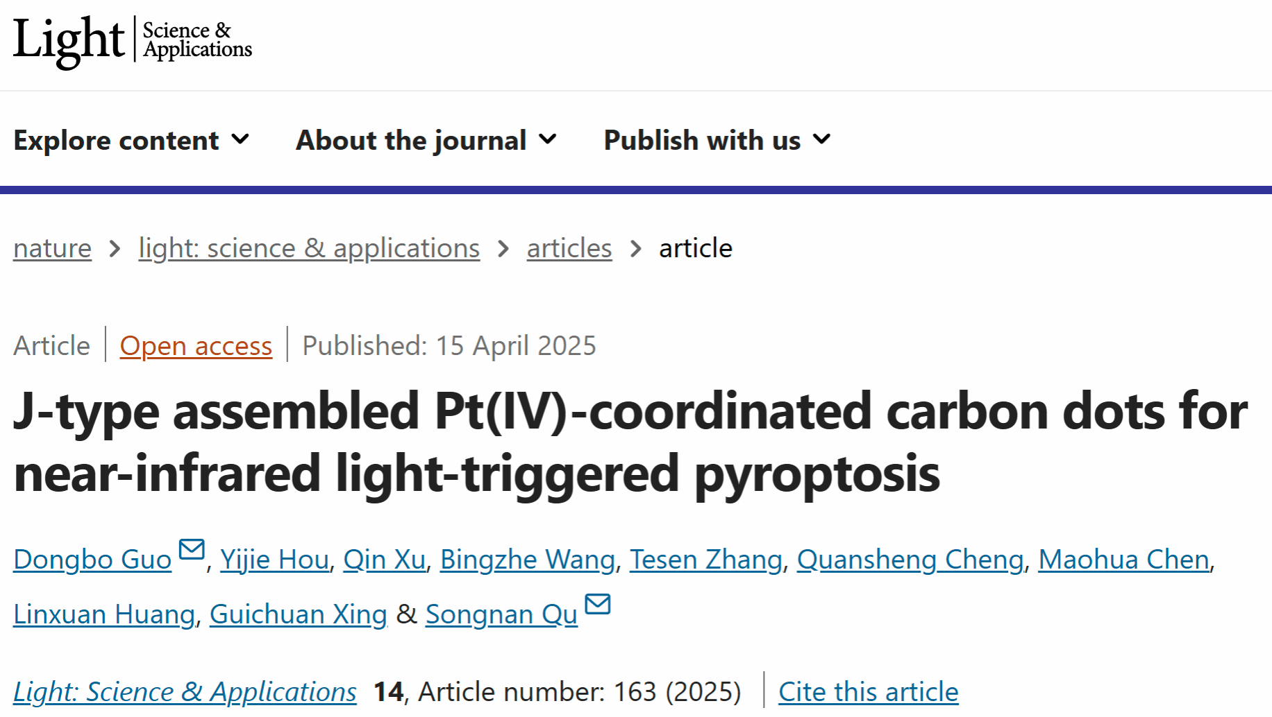 2025年4月15日,英国上市公司365郭东波副教授在光学顶级期刊《Light: Science and Applications》(Nature子刊,中科院一区Top期刊,影响因子20.6)发表题为“J-Type Assembled Pt(lV)-Coordinated Carbon Dots for Near Infrared Light-Triggered Pyroptosis”的第一单位研究论文。