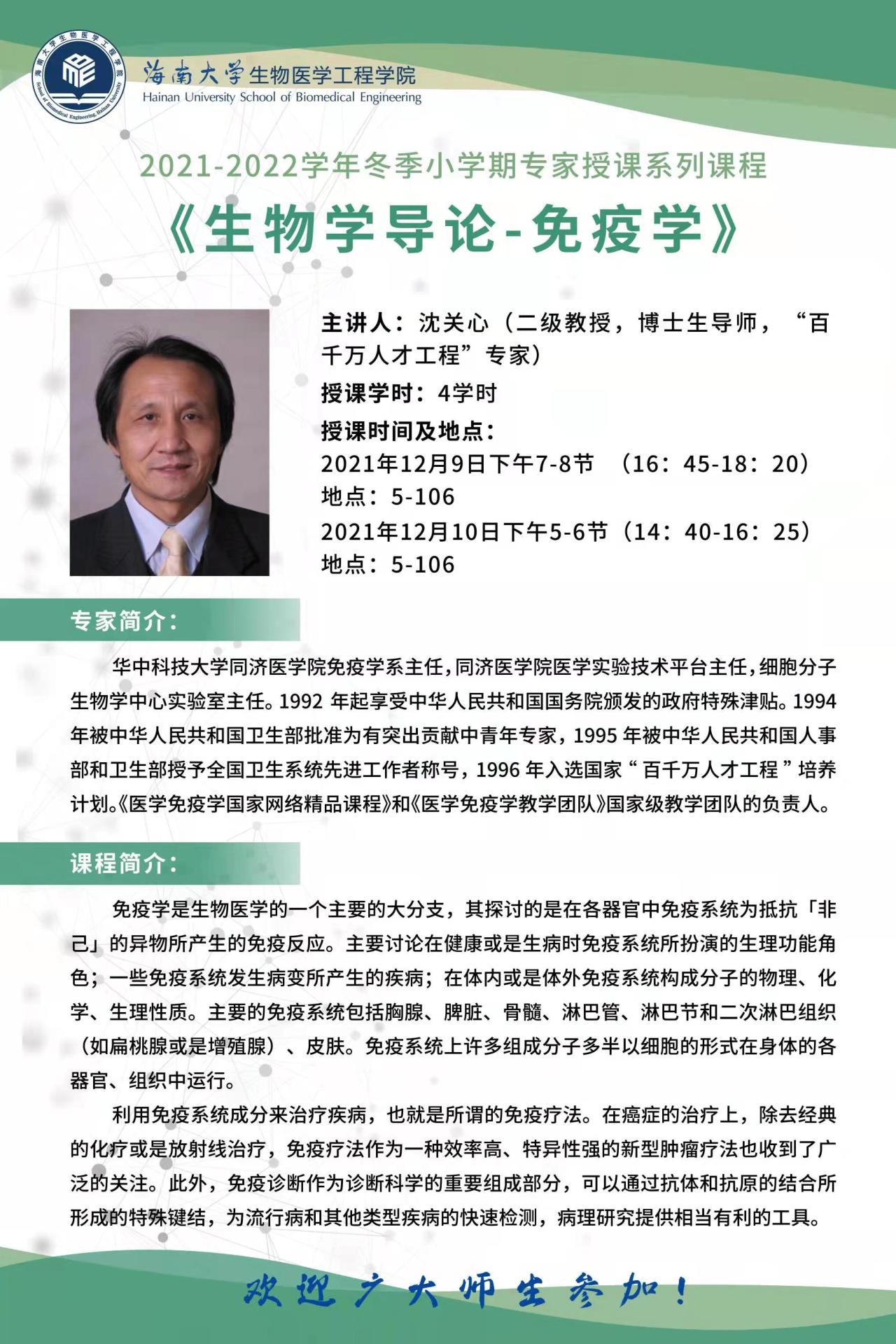 【2021-2022学年冬季小学期海报】沈关心教授(华中科技大学):《生物学导论-免疫学》